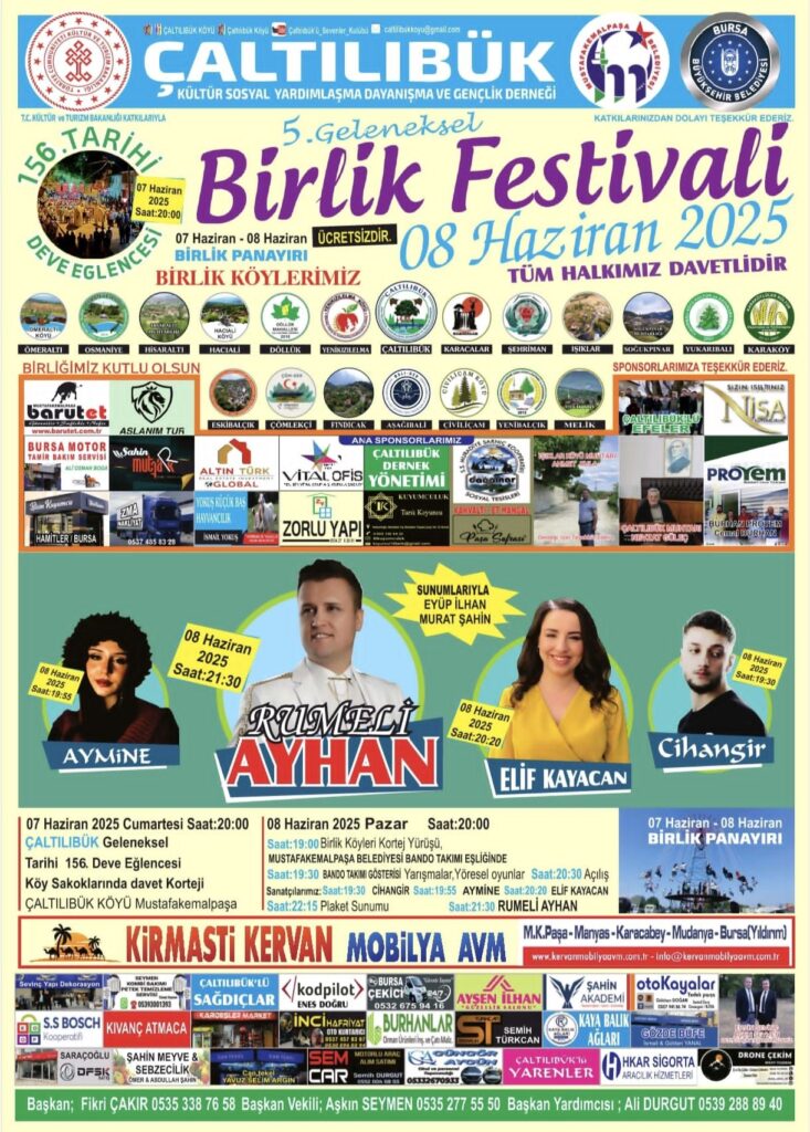 7-8 Haziran tarihlerinde gerçekleştirilecek renkli festival, tarihi deve oyunları, panayır ve halk konserlerinin yanı sıra birçok etkinliğe ev sahipliği yapacak. Çaltılıbük Kültür, Sosyal Yardımlaşma, Dayanışma ve Gençlik Derneği öncülüğünde düzenlen Birlik Festivali için geri sayım başladı. Kültür ve Turizm Bakanlığı, Bursa Büyükşehir Belediyesi, Mustafakemalpaşa Belediyesi ve 20 mahalle derneğinin katkılarıyla 5.’si düzenlenecek olan Birlik Festivali, bu yıl da dopdolu geçecek.