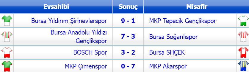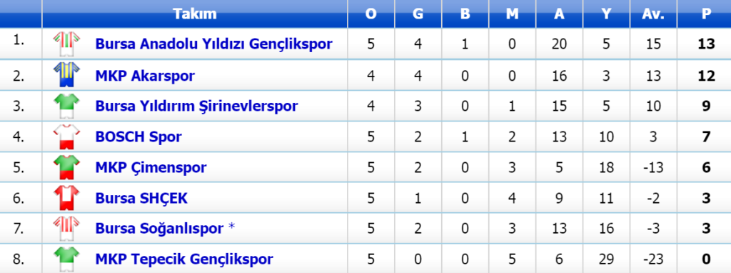 8 takımlı grubun dibine demir atan puansız Tepecik Gençlik ise deplasmanda karşılaştığı Bursa Yıldırım Şirinevler’e 9-1 mağlup oldu. 5’inci maçında da puan alamayan Tepecik, bu skorla kötü gidişatını sürdürdü.