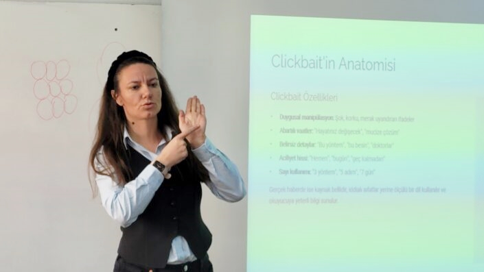 Kent Bursa Gazetesi Sorumlu Yazı İşleri Müdürü Yasemin Özkerem ise sunum boyunca haber başlıklarının öneminden, clickbait anatomisinden, sosyal medyada sağlıkla ilgili bilgi krizinden ve bir içeriğin ‘haber mi yoksa reklam mı?’ karmaşasından söz etti.