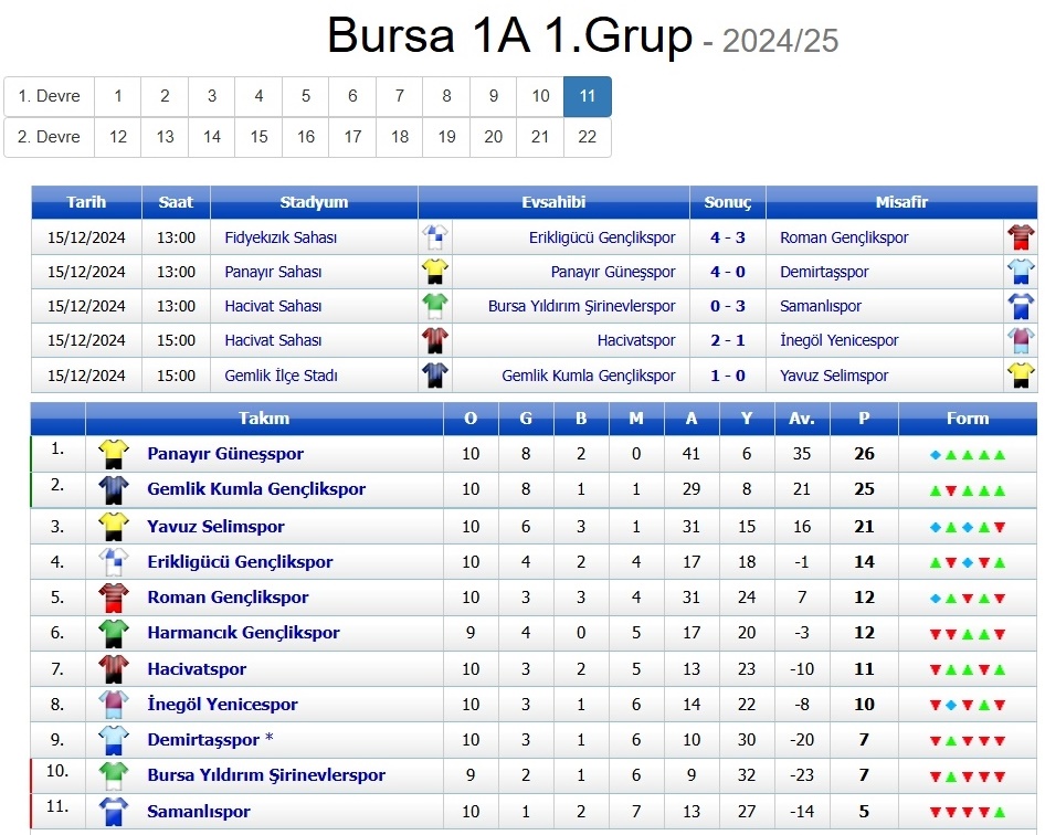 1. Grup’ta bulunan Roman Gençlik, 11. haftada deplasmanda karşılaştığı Erikligücü’ne 4-0 mağlup oldu. 11 takımlı grupta ilk devreyi 12 puanla 5. sırada tamamlayan kırmızı-siyahlı takım, 3 galibiyet, 3 beraberlik ve 4 yenilgi alırken,  31 gol atıp, 24 gol yedi.  Roman, 12. haftada Hacivat’a konuk olacak.