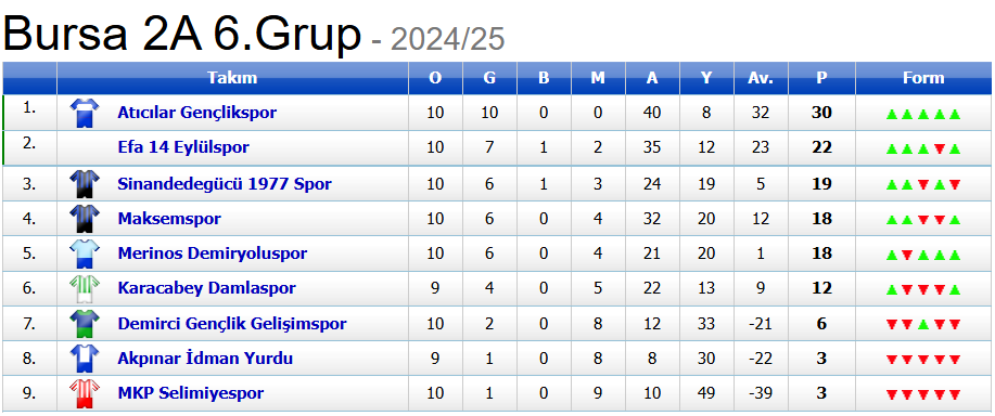 9 takımlı 6. Grup’ta bulunan EFA 14 Eylül ise sezonun 7. galibiyetini Demirci Gençlik Girişim karşısında aldı. Zorlu maçta rakibin 4-3’lük skorla geçen kırmızı-beyazlı takım, puanını 22 yaparak 2. sıradaki yerini korudu. Zirve takibini sürdüren EFA 14 Eylül, önümüzdeki maçta Akpınar İdman Yurdu ile sahasında karşılaşacak.