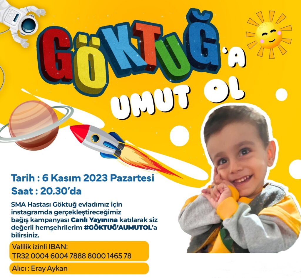 SMA Tip-2 kas hastalığıyla mücadele eden 2,5 yaşındaki Göktuğ Aykan için sosyal medya canlı yayınıyla yardım kampanyası düzenlendi. ‘Göktuğ’a Umut Ol’ temalı yayına katılan Belediye Başkanı Mehmet Kanar, küçük çocuğun tedavisi için 30 bin TL bağışta bulundu. Aykan Ailesi ile birlikte sosyal medya canlı yayınına katılan Başkan Mehmet Kanar, Göktuğ Aykan’ın gerekli tedaviyi görebilmesi için 1,8 milyon dolara (56 milyon TL) ihtiyacı olduğunu hatırlattı.