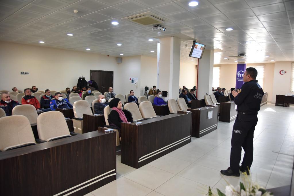 Mustafakemalpaşa Grup Amirliği İtfaiye ekibinden Selman Turgut, ‘yangın nedir, yangın çıkış nedenleri, yangında alınacak önlemler, yangın esnasında yapılması gerekenler, yangın öncesi ve sonrası hareket tarzları, doğru yangın ihbarı verme ve yangınlara müdahale’ konularında belediye çalışanlarını bilgilendirdi.