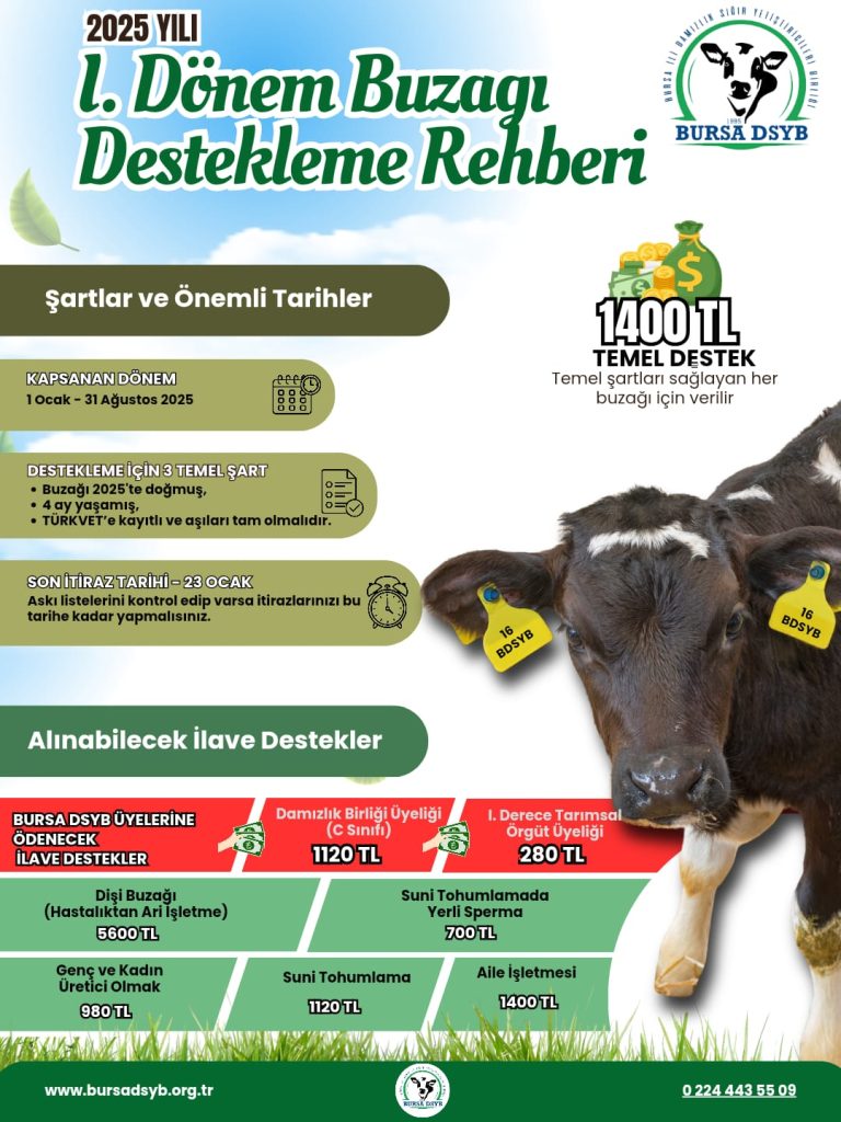 Bursa Damızlık Sığır Yetiştiricileri Birliği (BDSYB) Yönetim Kurulu Başkanı Bülent Tunca, birlik üyelerinin buzağı başına toplam 1400 TL ek destek alacağını açıkladı.