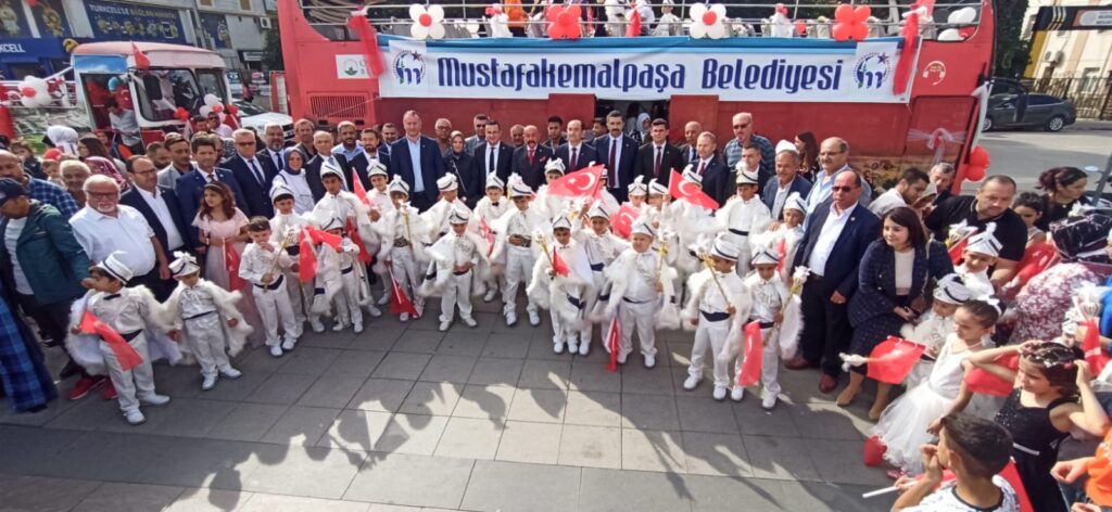 Cumhuriyet Bayramı coşkusunun dört bir yanı sardığı 100. yıl kutlamaları kapsamında Mustafakemalpaşa Belediyesi tarafından bu yıl 7.’si düzenlenen ‘Toplu Sünnet Şöleni’de gerçekleştirildi. Çocuklarının ilk mürüvvet heyecanını yaşayan ailelere protokolde eşlik etti. Erkekliğe ilk adımını atan 40 sünnet çocuğuna bisiklet hediye edildi.