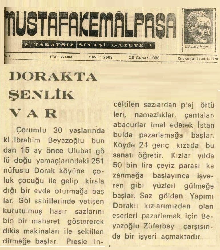 Eskiden Dorak Köyü’nde hasırcılık mesleği her evde varmış. Hasırcılık mesleği basit şekilde tezgâhlarda yapılırmış. Göl içinden biçilen sazlar kurutulur, demet halinde evlere getirilirmiş.
