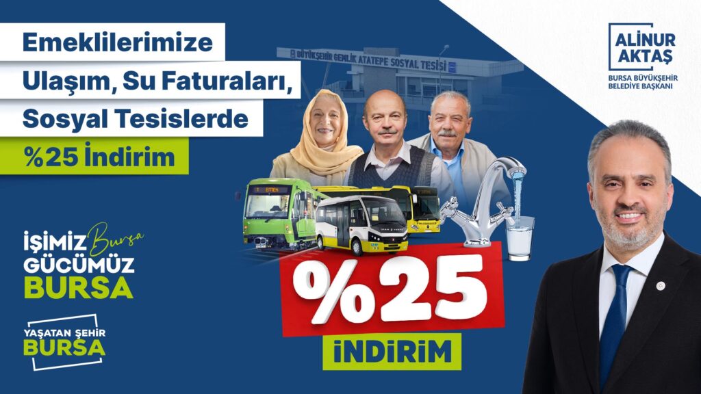 Bursa Büyükşehir Belediye Başkanı Alinur Aktaş, yeni dönemde tüm emeklilere ulaşımda, su faturalarında ve sosyal tesislerde yüzde 25 indirim uygulanacağını belirterek; “Emeklilerimize Ramazan Bayramı ve Kurban Bayramı olmak üzere yılda 2 kez 1.500 TL’lik nakdi destek sunuyoruz. Başvuru sürecini uzattık. Tüm emeklilerimizin bu destekten yararlanmasını istiyoruz” dedi.