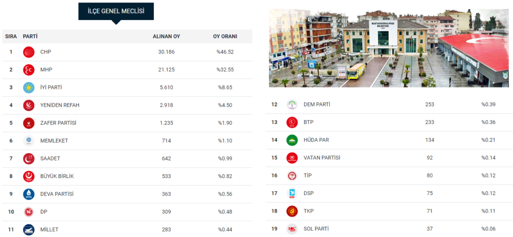 CHP’nin meclis listesi, Erdem’e göre % 2.86 (2.109 oy) daha az oy almasına rağmen 1. parti oldu. Meclis üyeliği seçimlerinde %46.52’lik oy oranı (30.186 oy) yakalayan CHP, 3 kişilik kontenjan dahil 31 üyeli Mustafakemalpaşa Belediye Meclisi’nde 20 sandalye kazandı.