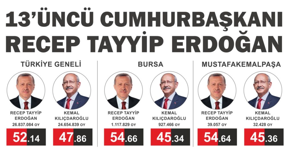 Mustafakemalpaşa’da 28 Mayıs Cumhurbaşkanlığı ikinci tur seçimlerinde bir kez daha sandıklardan Cumhur İttifakı Adayı Recep Tayyip Erdoğan açıktı.