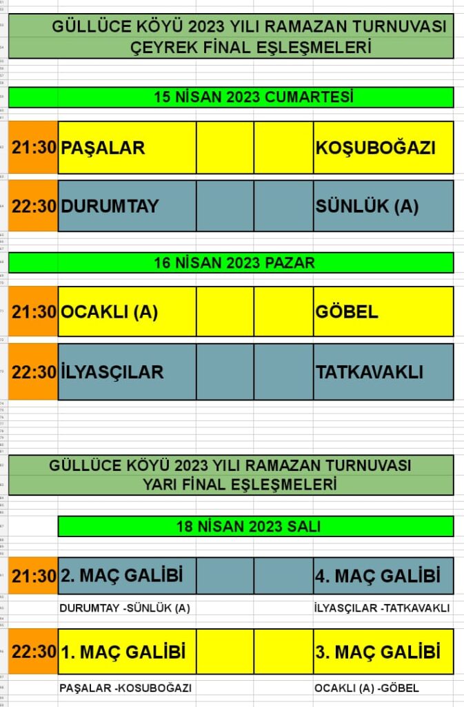 Çeyrek finalin diğer müsabakalarında ise 16 Nisan Pazar saat 21.30’da Ocaklı (A)-Göbel, saat 22.30’da da İlyasçılar-Tatkavaklı maçları oynanacak.