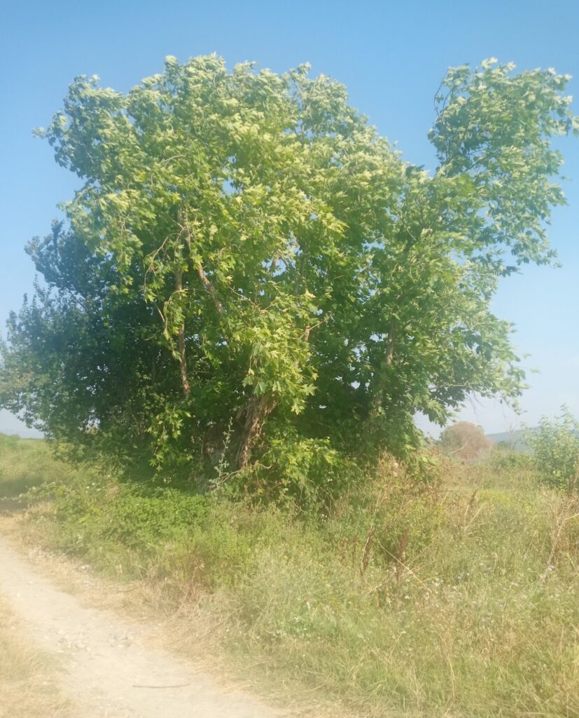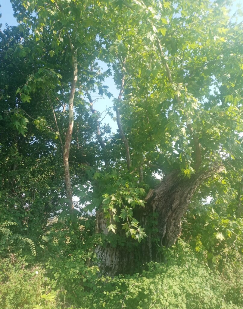 Eski yol üzerinde koca çınar var. Kovuğunda 4 kişi otururdu. Koca çınar zamana dayanamamış yarısı kalmış. Koca Çınar altında insanlar dinlenmişler, gölgelenmişler. Koca Çınar zamanla gövdesi boşalmış, hala ayakta. Muhtar Mehmet Kütük ile beraber çeşme yanına Koca Çınara kardeş bir çınar fidanını toprakla buluşturduk. Koca çınar kadar yaşaması dileğiyle…