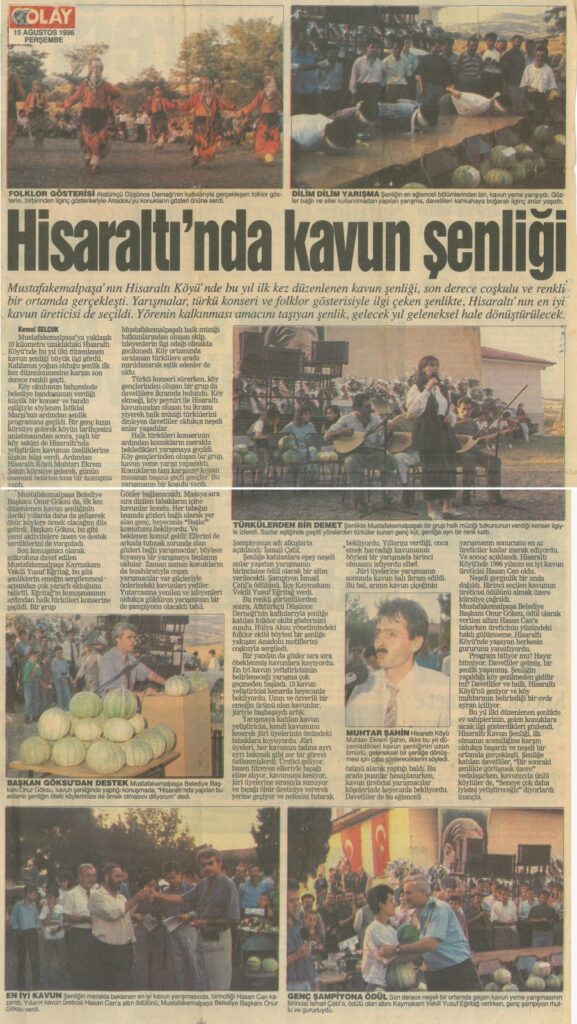 HİSARALTI KÖYÜ’NDE KAVUN ŞENLİĞİ: 27.07.2020 tarihinde şenliği düzenleyen o zamanın muhtarı Ekrem Şahin ile yaptığım görüşme; 2008 yılına kadar Hisaraltı, Behram ve çevre köylerde Yeşil Bursa (Hırsız almaz) kavunu ekiliyordu. Kavunun dış kabuğu beyazımsı yeşil idi. Köyümüzde 90 hanenin 50 hanesi 2’şer dönüm ekerdi. İlçede yetişen en lezzetli ve tatlı kavunuydu. Yerli tohum ekiyorduk.Kavunun tanıtımı için azalarım Sebahattin Çakır, Mustafa Yakup, Mehmet Aktaş, Mustafa Burak ile birlikte muhtarlık kararı aldık. 11 Ağustos 1996 tarihinde yapılmasına karar verdik. İlçe Tarım Müdürlüğü de bize destek verdi.  Kavun Şenliği için köyümüzde kavun yetiştiren çiftçiler bilgilendirildi. En kaliteli kavun yetiştiricisi birincisi seçileceği, kavun yeme yarışması yapılacağı duyuruldu.
