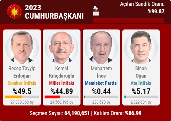 Geçici sonuçlara göre ilk turda yüzde 49.51 oy alan Recep Tayyip Erdoğan ile yüzde 44.88 alan Kemal Kılıçdaroğlu 28 Mayıs’ta ikinci turda yeniden yarışacak. İkinci turda geçerli oyların çoğunluğunu alan cumhurbaşkanı seçilecek.