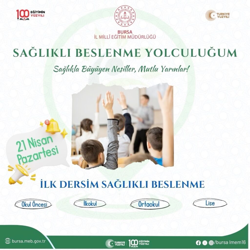 Bursa Milli Eğitim Müdürlüğü tarafından, öğrencilere sağlıklı beslenme bilinci kazandırma amacıyla yürütülen ‘Sağlıklı Beslenme Yolculuğum’ projesi kapsamında, Bursa dahil Mustafakemalpaşa genelindeki okul öncesi, ilkokul, ortaokul ve lise kademelerinde eğitim gören öğrenciler için, 21 Nisan 2025 Pazartesi günü birinci ders saatinde ‘İlk Dersim Sağlıklı Beslenme’ konusu işlendi. ‘Sağlıkla Büyüyen Nesiller, Mutlu Yarınlar’ sloganıyla yola çıkan kapsamlı farkındalık çalışmasına Mustafakemalpaşa Milli Eğitim Müdürü Veysel Çalık da katılarak destek verdi. Çalık, Kız Anadolu İmam Hatip Lisesi’nde derse girerek, öğrencilerle sağlıklı beslenmenin önemi üzerine sohbet etti.