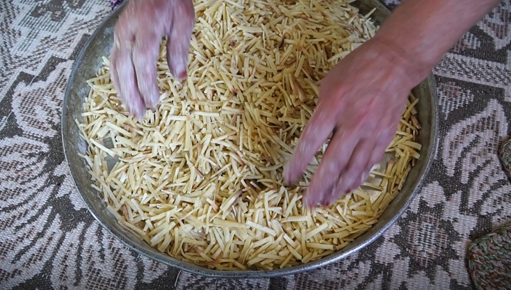Dinlenmeye bırakılan yufkalar eşit şeritler halinde kesilip, yeniden maşingalarda pişirilerek damak çatlatan lezzet haline dönüşüyor. İmece usulü yüzyıllardır süre gelen gelenek sayesinde hem komşuluk ilişkileri ayakta kalıyor, hem en doğal yiyecekler sofralara taşıyor.