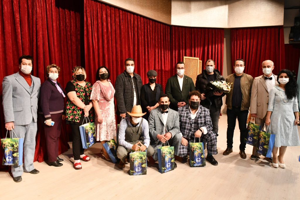 Tiyatro Günü’nü kutlayan Belediye Başkanı Mehmet Kanar, oyunculara çeşitli hediyeler vererek hatıra fotoğrafı çektirdi.
