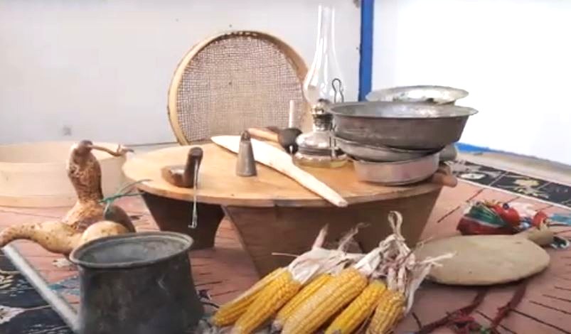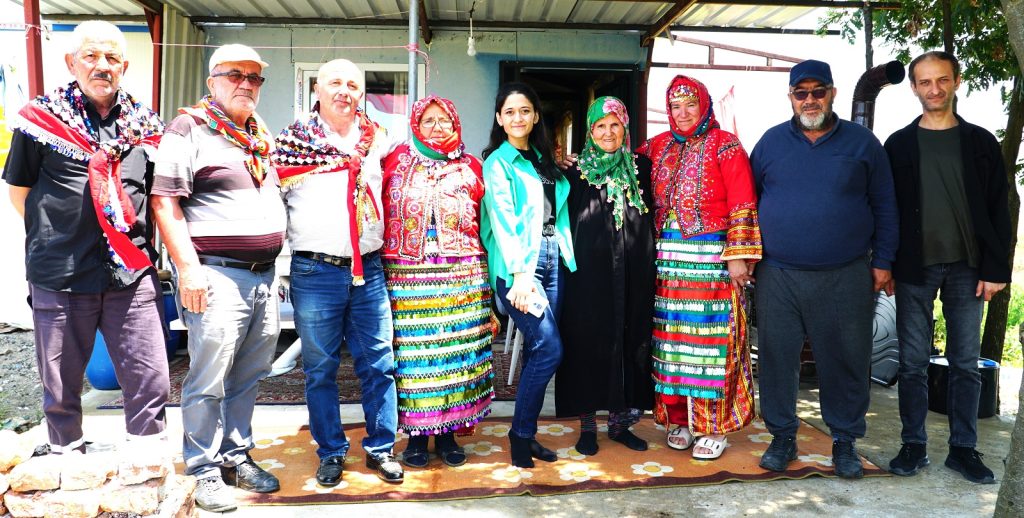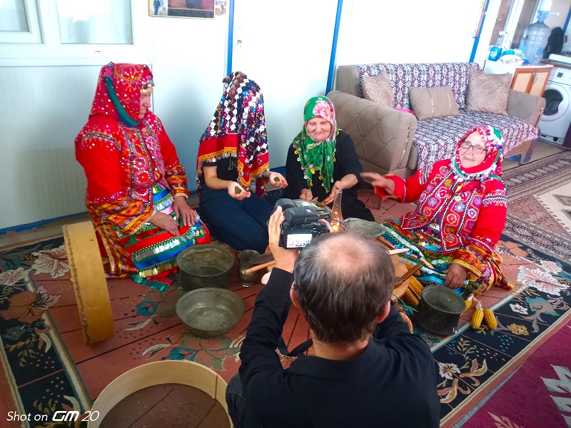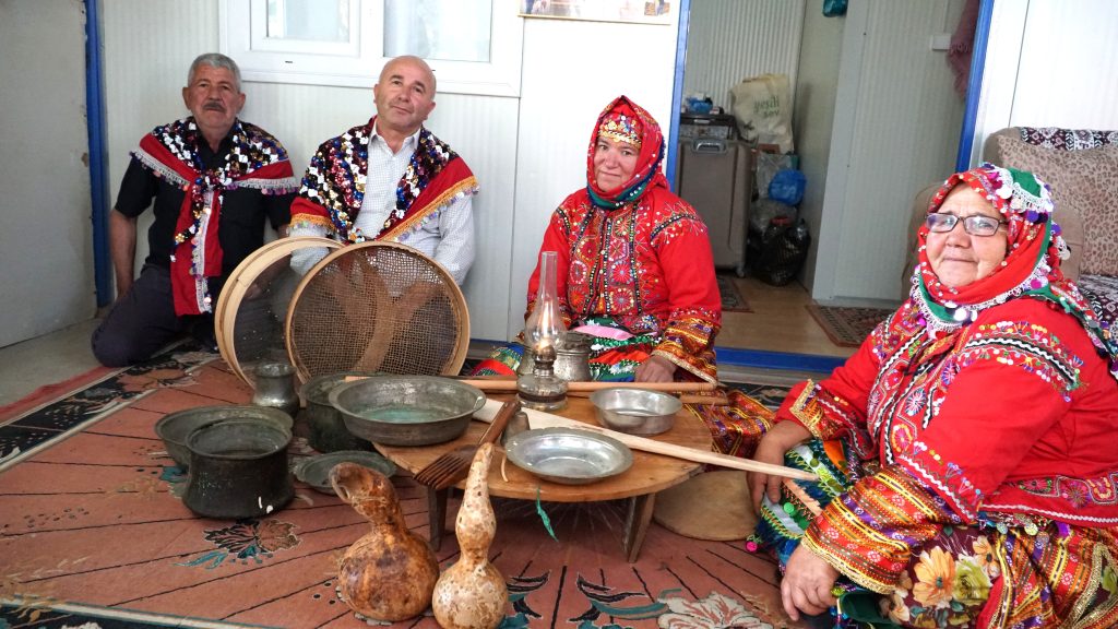 Cengiz Yavuz’un evinde misafir oluyoruz. Cengiz Bey Bursa’da çalışmış, emekli olmuş. Konteyner evin salonunda geçmişte kullanılan eşyalarda bir kısmı duvarlarda asılı, raflarda dizili. Bakır su tası, bakır keşkek tenceresi, ağaç sofra, gaz lambası, aba dokunma tarağı, deri ipli kalbur (buğday, kuru tarhana elenir) gibi eşyalar sofranın üzerine ve yanına dizdik. Bu kültürel mirası yörük giysili Gülcan Yavuz ve Şerife Demir anlattı.