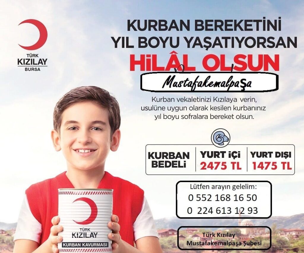 Mustafa Eren, Kızılay’ın ‘Kurban’da Kızılay Modeli’ sayesinde vekalet veren vatandaşlar için veterinerler tarafından seçilen kurbanlıkların, din görevlileri, veterinerler ve noterlerin bulunduğu ortamda dini kurallara uygun bir şekilde ve son derece hijyenik ortamlarda vekalet sahiplerinin isimleri okunarak, Kurban Bayramı’nın ilk üç günü kesileceğini ifade etti. Bu model sayesinde hayırseverlerin kurban ibadetlerini, amacına ve kuralına uygun olarak yerine getirebileceğini hatırlatan Eren; “Kesilen kurbanlar yurtiçinde Et ve Süt Kurumu kombinalarında kavurma ya da kıyma konservesi haline getirilecek ve yıl boyunca ihtiyaç sahiplerine dağıtılacak. Bizler bu bağışların yerine ulaşması konusunda terimizin son damlasına kadar çalışıyoruz. Şubemize gelip çalışmalarımızı takip edebilirsiniz. Mustafakemalpaşa şubemize bağışlarınızı bekliyoruz” dedi.