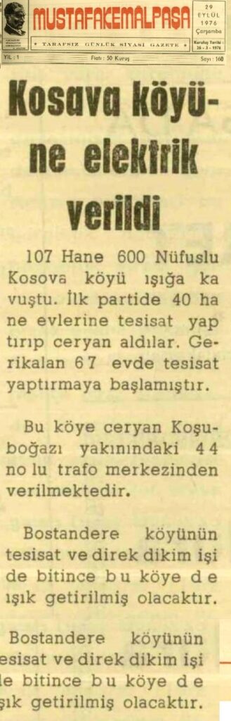 Bulgaristan’dan gelen Muhacirler, Mustafakemalpaşa Tahıl Meydanı civarında yerleşirler. Burada çok sinek olduğundan duramazlar, zamanın yerleştirme komisyonu tarafından şu anki köye yerleştirilirler. Kosova Köyü, Bulgaristan’dan gelen 13-14 hane, 93 Muhacirleri tarafından kurulmuştur. Bulgaristan’dan geldikleri yörenin adı Kosova olduğu için köy Kosova adını almıştır.