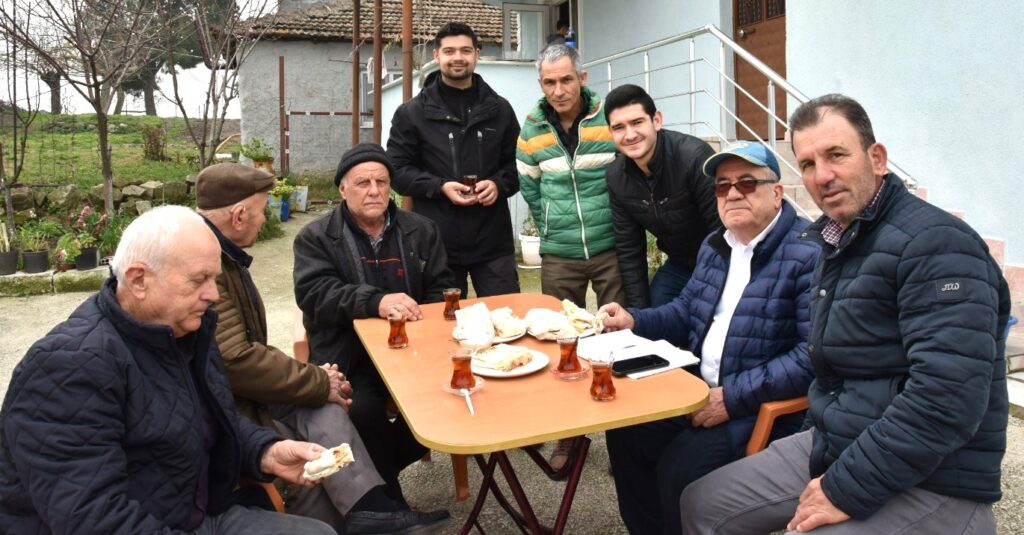KÖYDE YEMEK KÜLTÜRÜ: 9 Mart 2024 Cumartesi günü muhtar Selami Salım’ın evine misafir olduk. Yemek kültürü araştırması yaptık. Kış kilerinde neler var diye sorduk. Misafirlere kırma (kırmana) böreği ikram ediyorlar. Böreği kuru yufkaların arasına pırasa-lor ve koyarak fırında pişiriyorlar. Bütün patlıcanın yarılarak arasına kırmızı biber-lahana koyarak üzeri asma yaprağı veya lahana ile sarılarak ince iple veya mısır başağı sapı ile bağlanan turşu, biber, domates kurusu var. Ahlat turşusu kurulmuş. Suyu içiliyor. (Toplanan ahlatlar yıkanır, temiz bidonlara-fıçılara konur, çeşme suyu ile doldurulur. Güneşli alanda bekletilir. Arada bir havası alınır. Suyu sade içildiği gibi içine şeker konularak tüketilir.)