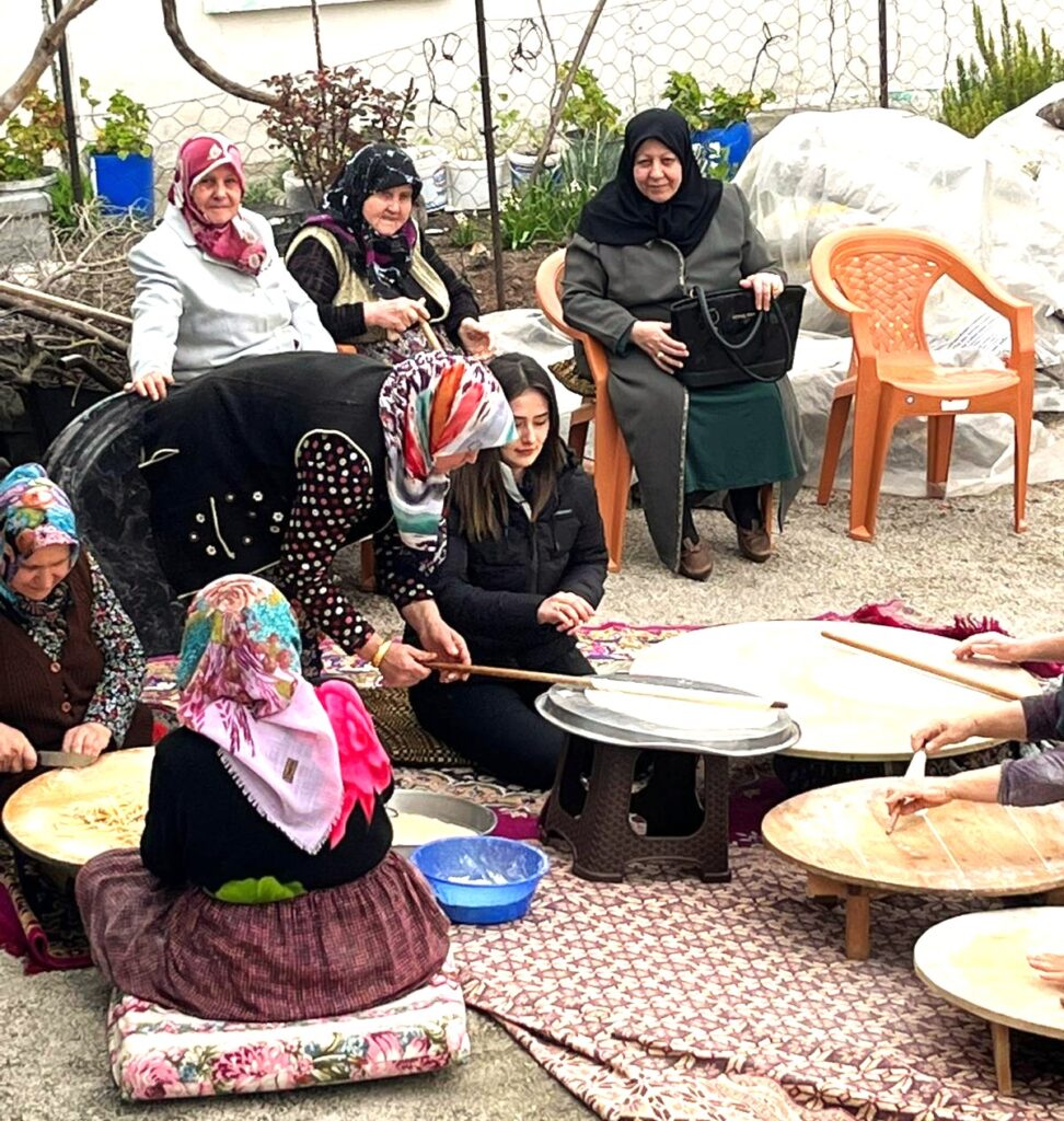 KÖYDE RAMAZAN HAZIRLIKLARI: Evlerde temizlik ve badana yapılır. Yufka, komşu kadınları tarafından imece usulü pişirilir. Muhtar Selami Salım’ın evinin avlusunda toplanan komşu kadınları yufka pişiriyorlardı. Bazısı hamur tutuyor, bazısı hamuru oklava ile açıyor, bazısı da yufkayı fırında pişiriyor. Bugünkü imecede Ayfer Aybey, Fevziye Aybey, Havva Şeker, Recebiye Salım, Seniye Salım, Şenel Salım, Hatice Mendir, Gülten Şeker vardı.