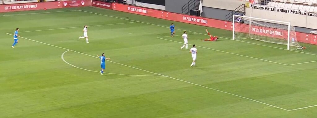 30. dakikada Bodrumspor öne geçti. Sağ kanattan Üzeyir’in yaptığı ortada ceza sahası içinde Erdem Çetinkaya savunma oyuncularına rağmen kafa vuruşuyla meşin yuvarlağı filelere gönderdi: 1-0.