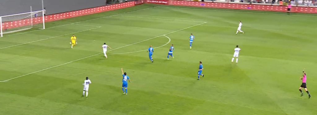 53. dakikada kendi yarı sahasından paslaşan Karacabeyli oyuncu Mevlüt Çelik’in hatalı pasında topu çalan Cenk Şen, sol çaprazdan ceza sahasına girdikten sonra yaptığı vuruşla skoru 3-0’a taşıdı.