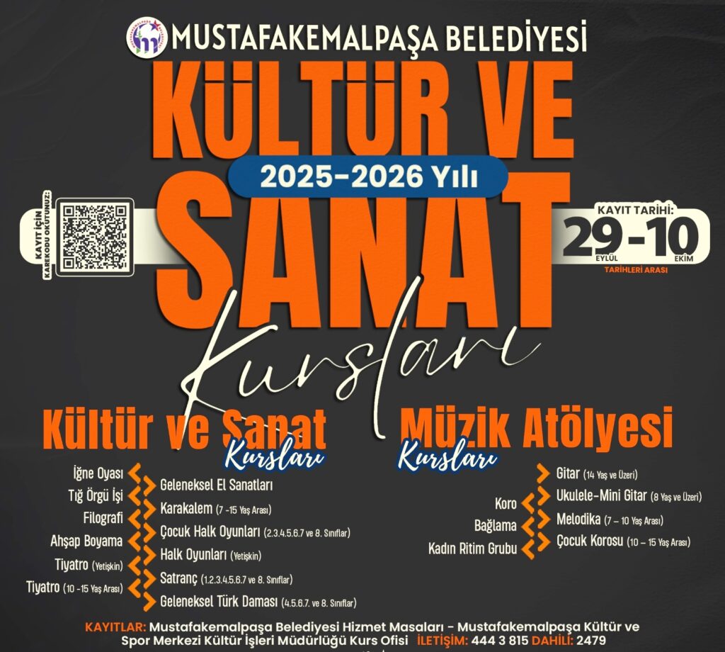 Kayıtlar, 29 Eylül-10 Ekim 2025 tarihleri arasında Mustafakemalpaşa Belediyesi Hizmet Masaları, Kültür ve Spor Merkezi Kültür İşleri Müdürlüğü Kurs Ofisi ile online başvuru üzerinden yapılabilecek.