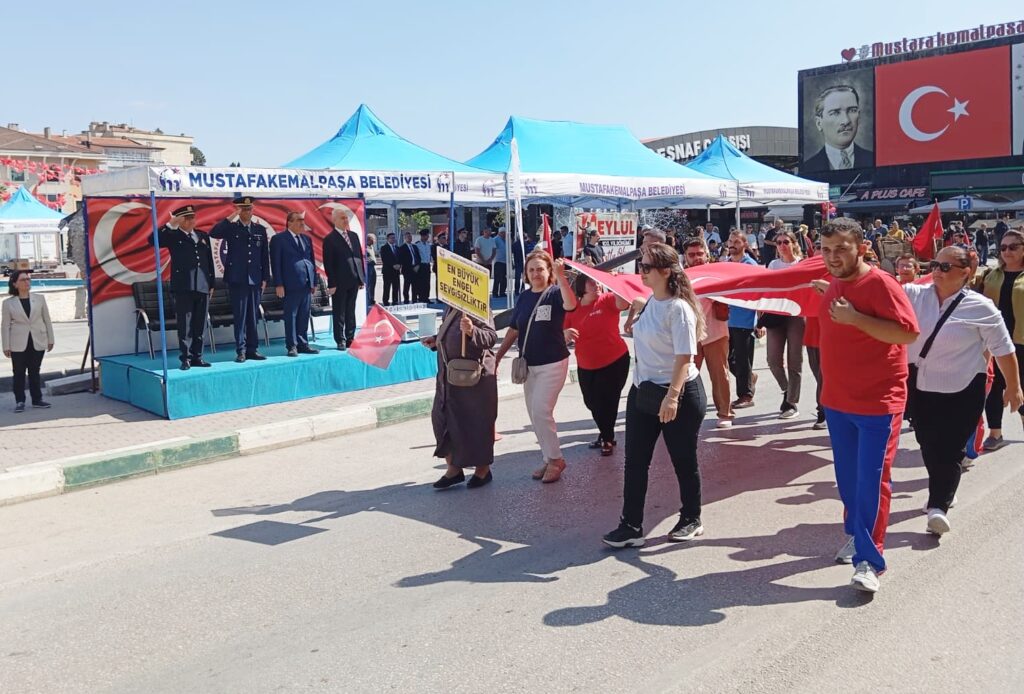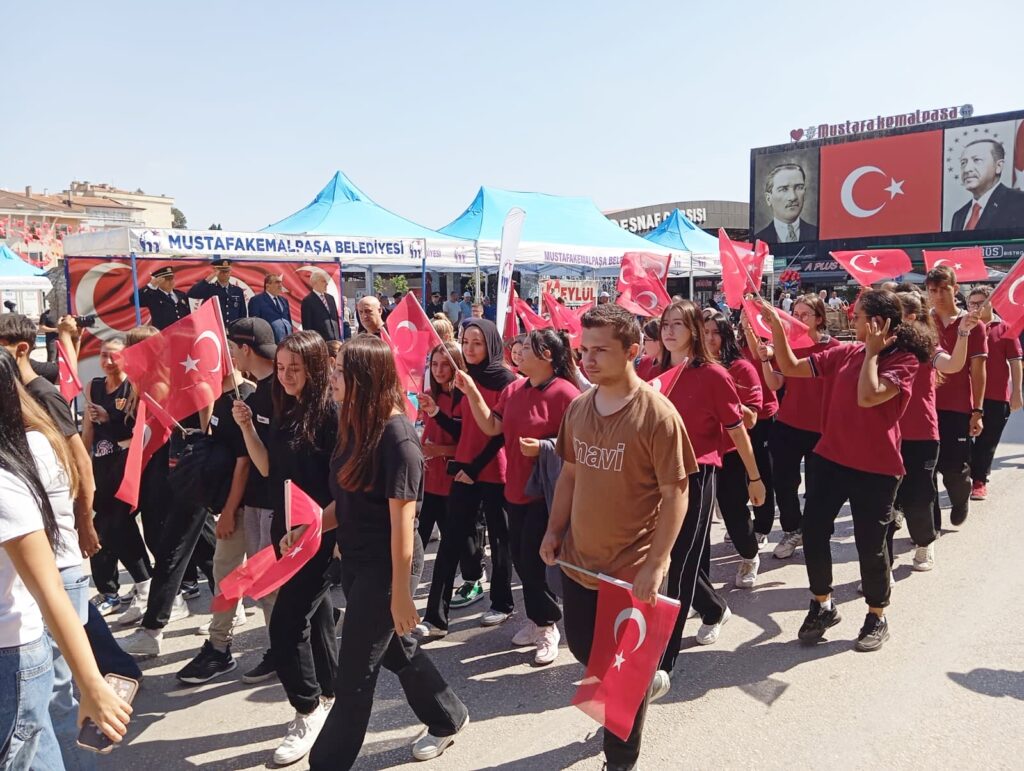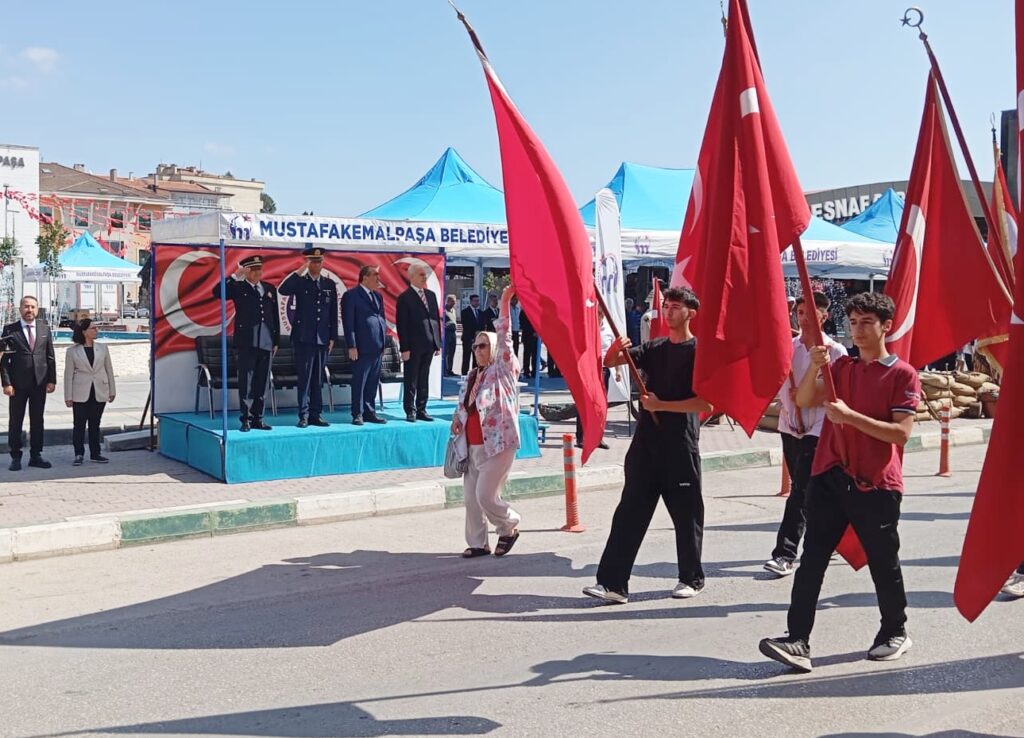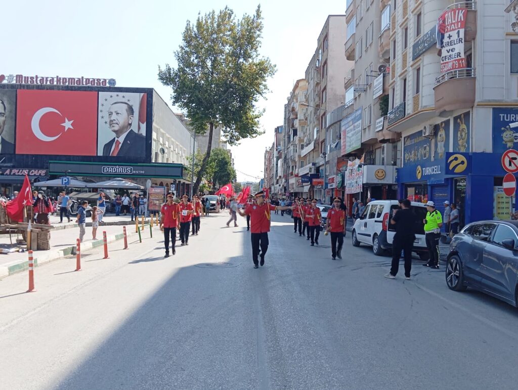 Mustafakemalpaşa Şehitlik ziyaretinde ise din görevlisi Ramazan Koçak’ın Kur’an-ı Kerim tilaveti ve Müftü Vekili Mehmet Kabak’ın yaptığı duanın ardından Belediye Bando Takımı eşliğinde Bursa Caddesi’nde bir kortej yürüyüşü gerçekleştirildi.