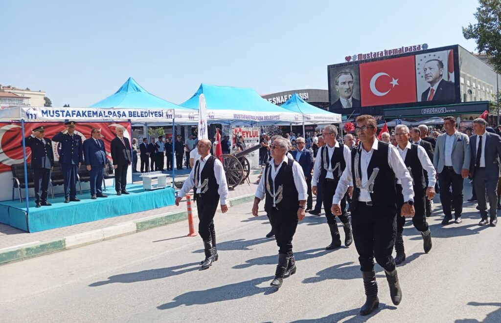 Protokolün, korteje katılan grupları selamladığı törende yöresel oyunlar sergilenirken, Öz Mustafakemalpaşa Güvercin Severler Derneği tarafından da güvercin gösterileri sunuldu.