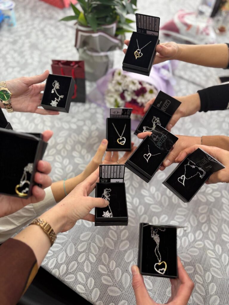 Okul Müdürü Zeki Kaplan, 24 Kasım’da anlamlı bir jest yaparak, okulda görev yapan tüm öğretmenlere şık hediyeler takdim etti. Öğle arasında düzenlenen programda öğretmenlere yemek ve pasta ikramı yapıldı. 24 Kasım’ı anlamlı kılan bir sürprize imza atan Kaplan, 25 kadın öğretmene pırlanta kolye, 8 erkek öğretmene ise saat, cüzdan, parfüm ve kemerden oluşan set hediye etti.