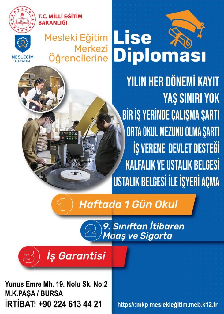 Yılın her döneminde yaş sınırı olmaksızın kayıt imkânı sunan Mesleki Eğitim Merkezi, lise diploması almak isteyenlerden bir iş yerinde çalışma ve ortaokul mezunu olma şartı arıyor.