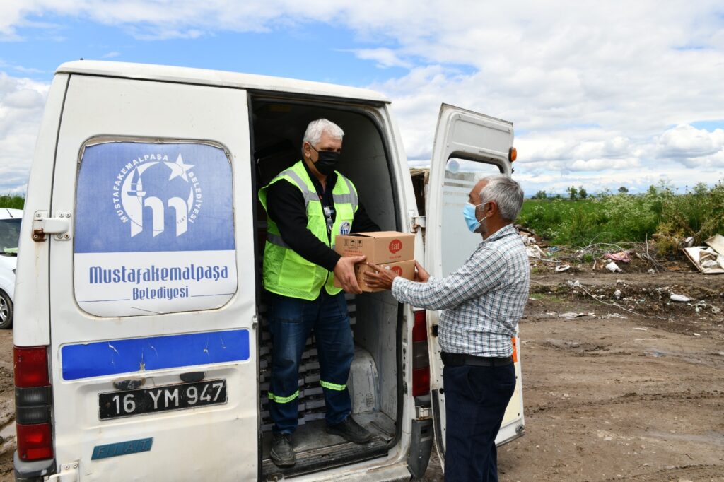 Özellikte tarım şehri Mustafakemalpaşa’da yoğunlukta olan sezonluk tarım işçilerinin daha sağlıklı bir ortamda yaşam sürmeleri ve mağduriyet yaşamamaları için çalışmalar yürütülürken Belediye Başkanı Mehmet Kanar’ın talimatı ile işçilere gıda yardımı yapıldı.