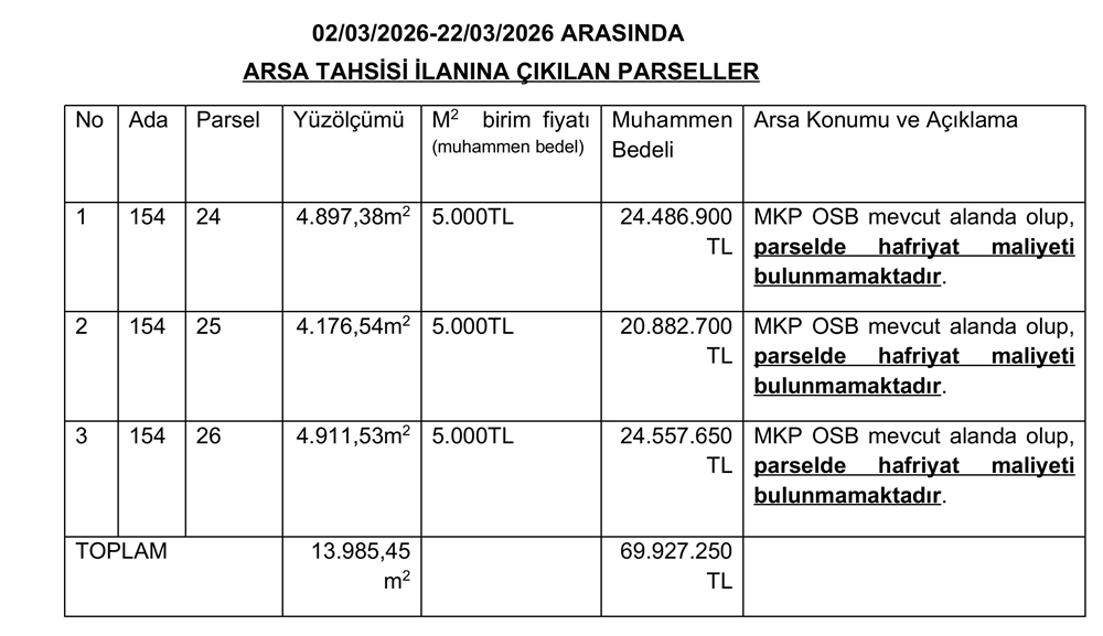 MKP OSB’nin mevcut yerleşim alanında bulunan 154 ada 24, 25 ve 26 numaralı toplam 13.985,45 metrekare yüzölçümlü parseller için tahsis takvimi ikinci kez revize edildi. Daha önce 1-25 Aralık 2025 tarihleri arasında yapılacağı açıklanan tahsis başvuruları, ilk olarak 5-25 Ocak 2026 tarihleri arasına ertelendi. Alınan yeni kararla birlikte başvuru süreci bir kez daha değiştirilerek 2-22 Mart 2026 tarihleri arasında gerçekleştirilecek şekilde yeniden planlandı.