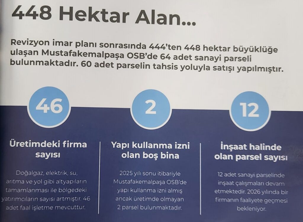 Ayrıca, geçtiğimiz yıllarda MKP OSB sınırları içinde bulunan 154 ada 3 nolu 13.916,12 metrekarelik parselde yer alan firmanın üretime geçmemesi nedeniyle, tapu iptal davası açılarak ilgili parsel OSB adına tescillendi.