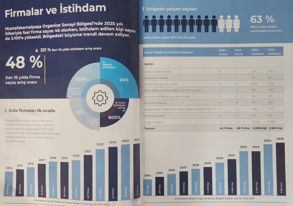 MKP OSB’deki firma ve istihdam sayıları ise son 12 yılda katlanarak büyüdü. 2014 yılında 24 olan firma sayısı yüzde 91 artışla 2025 yılında 46’ya, çalışan sayısı ise yüzde 605 artışla 512’den 3.100’e yükseldi.