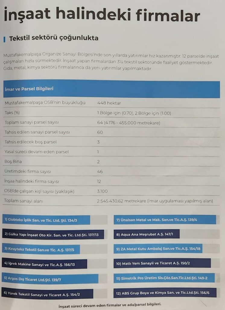 Globteks İplik, Gülka Yapı, Kırayteks Tekstil, İğrek Makine, Argos Dış Ticaret, Yürek Tekstil, Ünalsan Metal, Aqua Ana Meşrubat, ZA Metal, Matlı Yem, Simetrik Pro Üretim ve ABS Grup Boya ve Kimya firmalarının inşaat süreçleri devam ediyor.