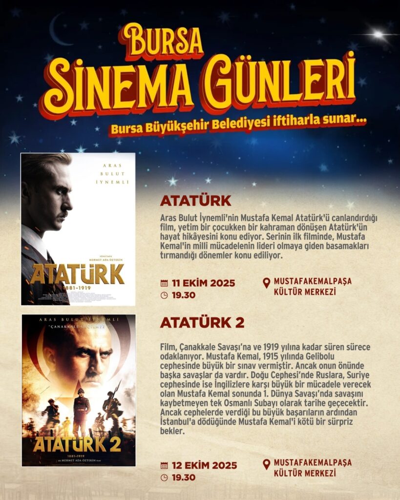 Cumhuriyetin ilanının 102. yıl dönümünün kutlanacağı Ekim ayında, tarihin dönüm noktaları beyazperdede yeniden hatırlatılacak. Etkinlik programı çerçevesinde, ‘Atatürk 1’ ve ‘Atatürk 2’ filmleri halkla buluşacak. Bursa Büyükşehir Belediyesi koordinasyonunda, Mustafakemalpaşa Belediyesi’nin katkılarıyla gerçekleştirilecek film gösterimi, 11-12 Ekim tarihlerinde saat 19.30’da Mustafakemalpaşa Kültür Merkezi’nde ücretsiz olarak gösterilecek.