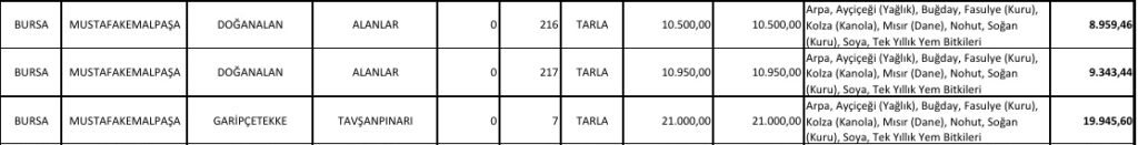 3 arazideki yetiştirilecek ürün grupları ise arpa, ayçiçeği (yağlık), buğday, fasulye (kuru), kolza (kanola), mısır (dane), nohut, soğan (kuru), soya ve tek yıllık yem bitkileri olarak ilan edildi.