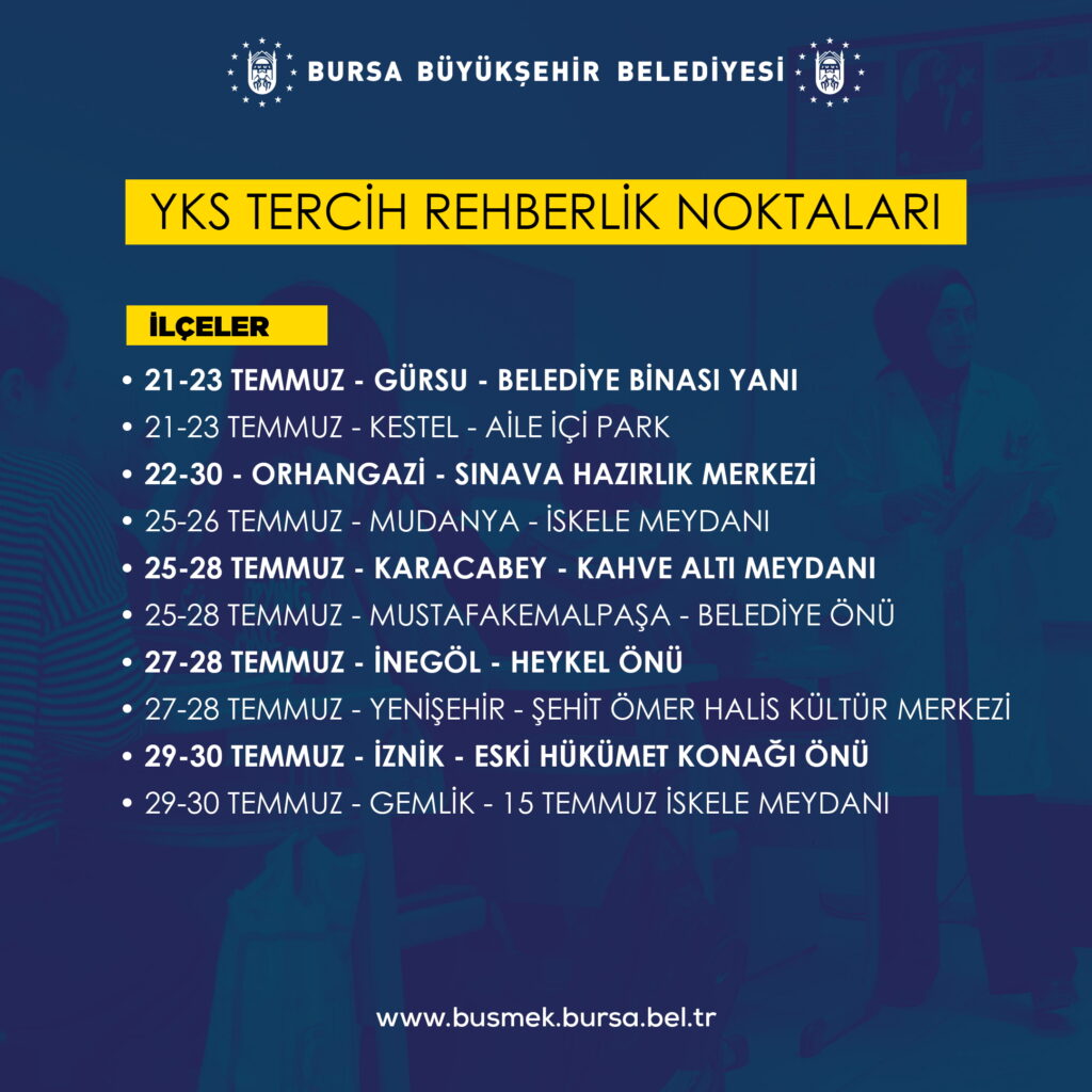 • Üniversite adayı gençleri YKS hazırlık sürecinde yalnız bırakmayan Bursa Büyükşehir Belediyesi, tercih döneminde de desteğini sürdürecek.
