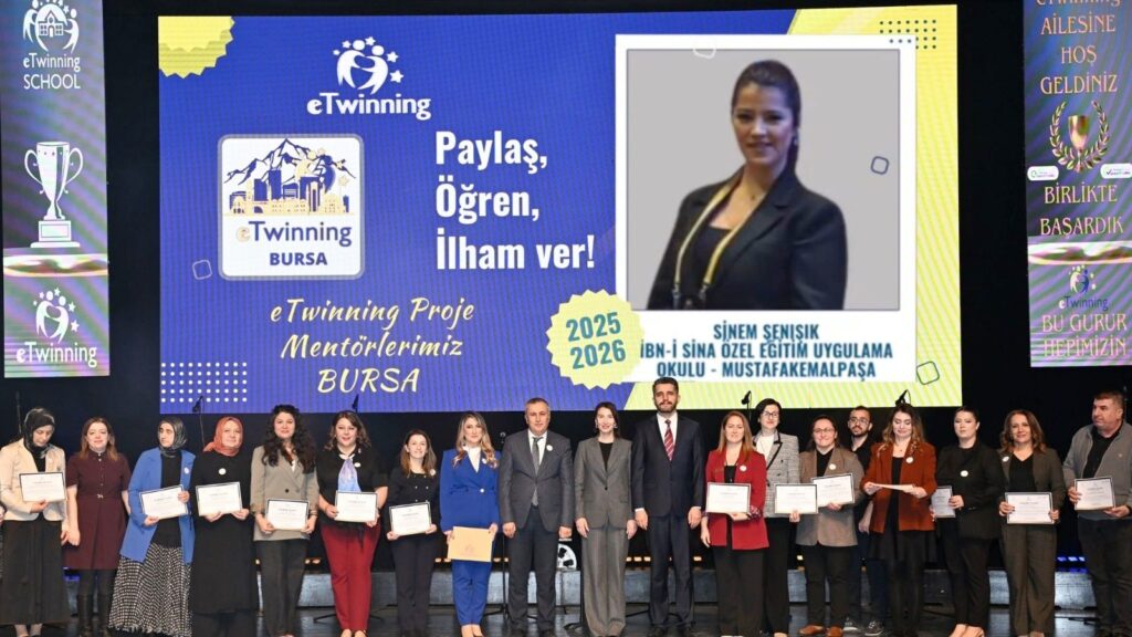 Ayrıca, eTwinning Bursa Koordinatörlüğü bünyesinde 2025-2026 Eğitim-Öğretim Yılı kapsamında yürütülen ‘Paylaş, Öğren, İlham Ver’ proje platformu çerçevesinde, eTwinner öğretmenlere mentörlük desteği sunan İbn-i Sina Özel Eğitim Meslek Okulu öğretmeni Sinem Şenışık da katkılarından dolayı eTwinning Türkiye Ulusal Destek Servisi Koordinatörü Ertan Kocabaş tarafından teşekkür belgesiyle onurlandırıldı.