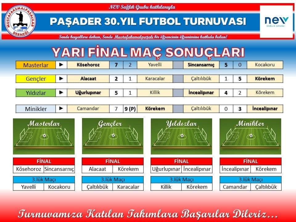Finalde, Masterler Grubu’nda Kösehoroz-Sincansarnıç, Gençler Grubu’nda Alacaat-Körekem, Yıldızlar Gurbu’nda İncealipınar-Uğurlupınar ve Minikler Grubu’nda ise İncealipınar-Körekem mücadeleleri oynanacak.  3.’lük maçlarında ise Yavelli-Kocakoru, Çaltılıbük-Karacalar, Killik-Körekem ve Camandar-Çaltılıbük karşılaşacak.