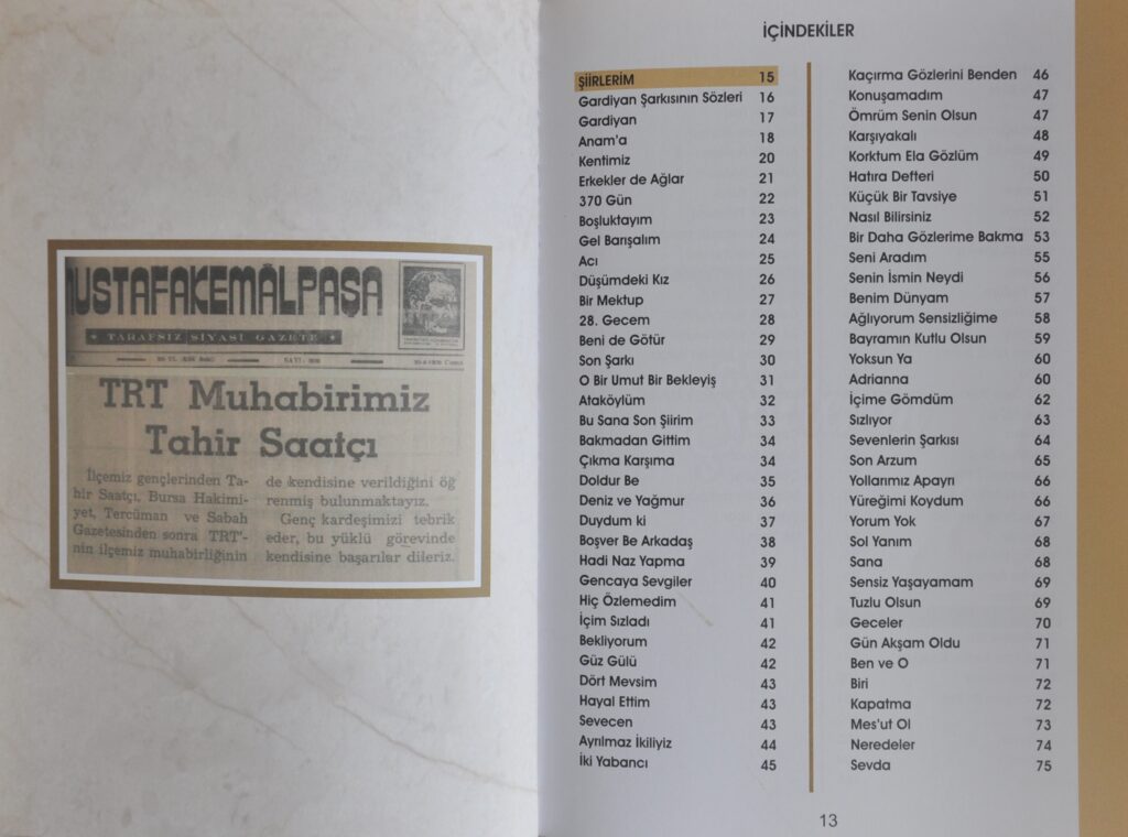 95 şiir, 18 köşe yazısı ve Mustafakemalpaşa’da dünden bugüne faaliyet gösteren spor kulüplerine dair 12 yazının bulunduğu kitap için Saatçı; “Mesleki yönden ilk adımı rahmetli Hüseyin Aydın ile birlikte ortaklaşa çıkardığımız ‘Mücadele’ adlı haftalık bir gazete çıkararak attım. Gazetecilik ve matbaacılık derken yarım asrı geride bıraktık. Bazen kendime şiirlerimi neden saklamadığım için kızdım, kitap projesi ortaya çıkınca da dostların yerel arşivlerine müracaat ettim. Bu kitapta bulabildiğim, yeni yazdığım şiirlerimin yanı sıra Mustafakemalpaşa’da çeşitli gazetelerde yayımlanmış yazılarımı bir araya getirdim. Yerel kültüre bir armağan olan kitabımın okuyucularla buluşmasına destek sağlayan herkese teşekkür ediyorum” dedi.