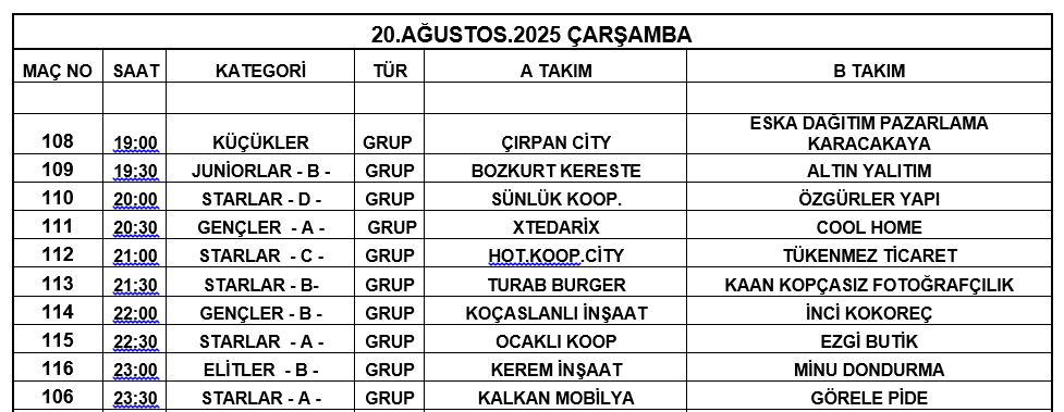 Her akşam 11 maça ev sahipliği yapan turnuvada çeyrek ve yarı final mücadeleleri 23-24 Ağustos tarihlerinde oynanacak. Turnuvanın finali ve ödül töreni ise 28 Ağustos Perşembe akşamı yapılacak.