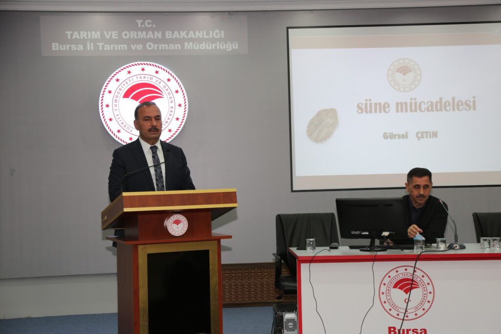 Müdür Hamit Aygül’ün konuşmasının ardından süne konusunda, Yalova Bahçe Kültürleri Merkez Araştırma Enstitüsü Müdürlüğünden Bitki Sağlığı Bölüm Başkanı Uzman Gürsel Çetin tarafından katılımcılara bilgilendirme yapıldı.