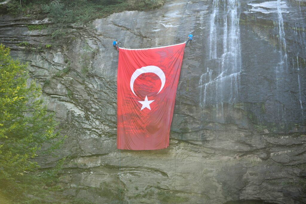 Bursa’nın doğa harikası Suuçtu Şelalesi, Mustafakemalpaşa’nın 100. kurtuluş yıl döneminde 100 metrelik dev Türk Bayrağı ile güzelliğine güzellik kattı.