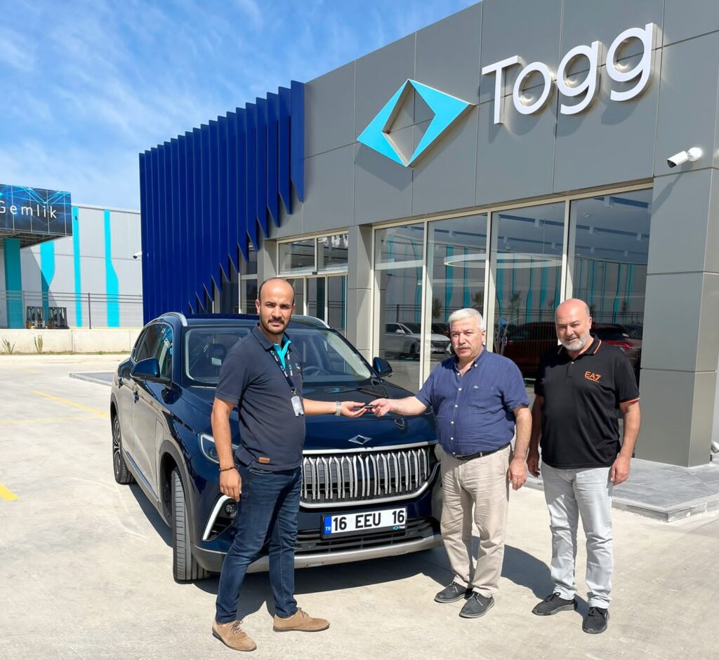 TSO Yönetim Kurulu Başkanı Tekin Uzkınay ve Yönetim Kurulu Üyesi Sinan Taşkın, ‘16 EEU 16’ plakalı Gemlik Mavisi rengindeki yerli elektrikli otomobil ‘TOGG T10X’i, Togg Gemlik üretim tesislerinde teslim aldı.