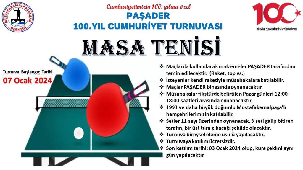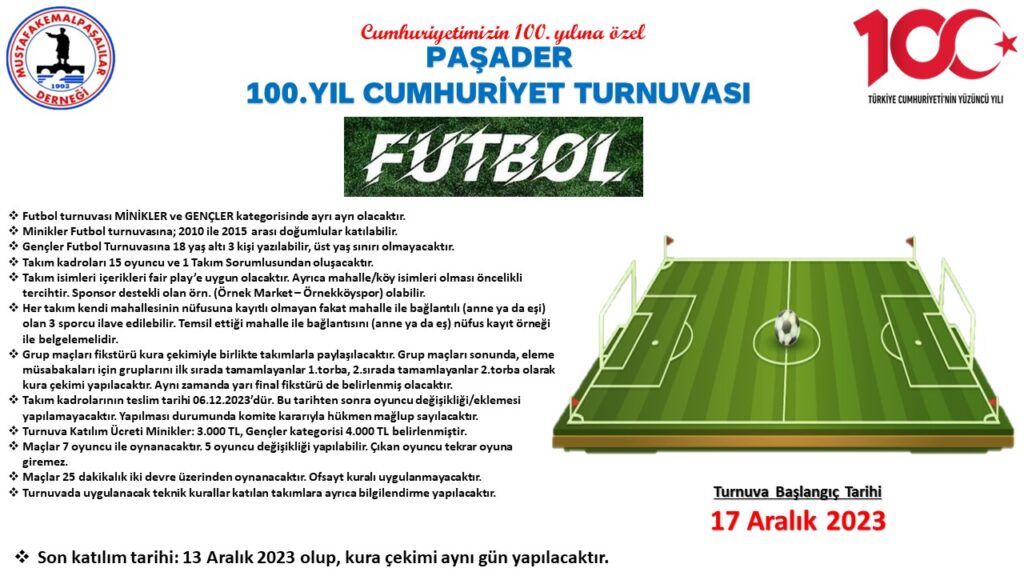 PAŞADER Yönetim Kurulu Başkanı Mustafa Gümüş; “Cumhuriyetimizin 100.yılına özel düzenlemiş olduğumuz ‘100.Yıl Cumhuriyet Turnuvası’, futbol branşında 17 Aralık 2023 Pazar günü başlıyor. Bu sene geçen yıldan farklı olarak futbolun yanı sıra masa tenisi ve basketbol branşları da çeşitlilik bakımından turnuvayı zenginleştirecek. Bine yakın katılımcı sayısına ulaşılmasını beklediğimiz turnuvanın amacı, Mustafakemalpaşalı hemşehrilerimizin tanışması, buluşması ve kaynaşmasıdır. Geliri, Mustafakemalpaşalı üniversite öğrencilerinin öğrenim burslarına aktarılacak olan ‘PAŞADER 100. Yıl Cumhuriyet Turnuvası’na sponsorluk veya farklı konularda destek olmak isteyen firma ve kuruluşlar, derneğimizin kurumsal iletişim hattı 0 505 766 45 16 aracılığıyla ulaşabilirler” dedi.