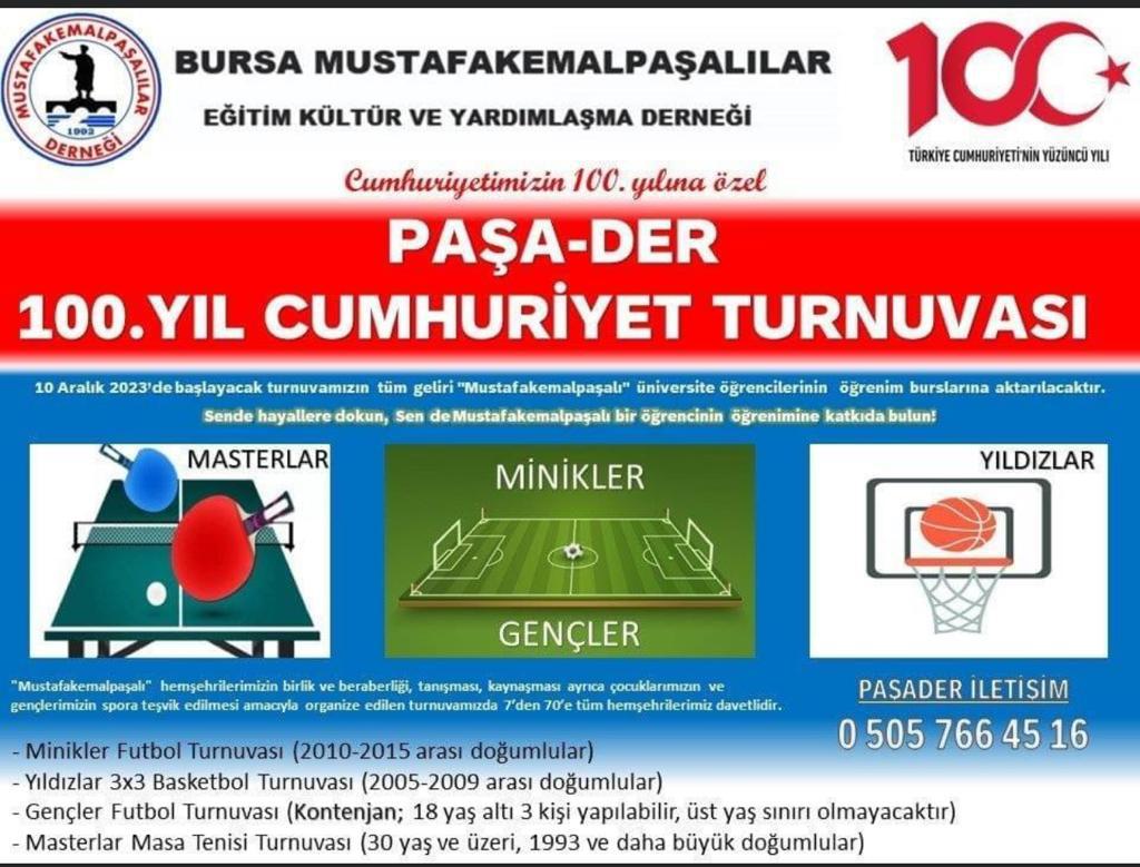 Bursa Mustafakemalpaşalılar Eğitim-Kültür ve Yardımlaşma Derneği’nin (PAŞADER), eğitim yararına düzenlediği ‘PAŞADER 100. Yıl Cumhuriyet Turnuvası’ için geri sayım başladı.