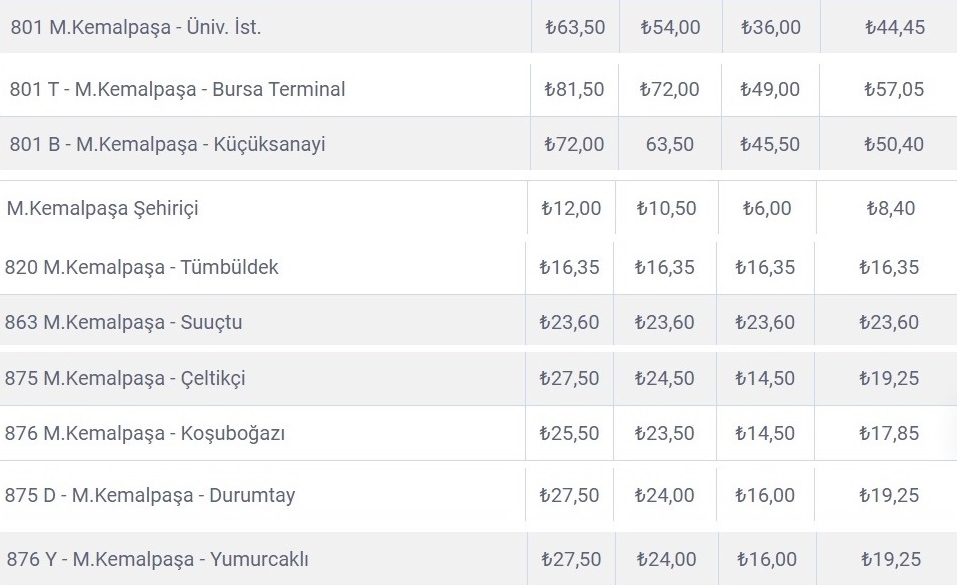 Mustafakemalpaşa’dan Bursa Terminal’e ulaşım ise 6 TL’lik zamla tam yolcuda 81.50 TL’ye çıkarken, bu güzergâhta indirimli fiyat 72.00 TL, 45.50 TL’lik öğrenci tarifesi 49.00 TL ve mezuna kalan öğrenci de 57.05 TL oldu.